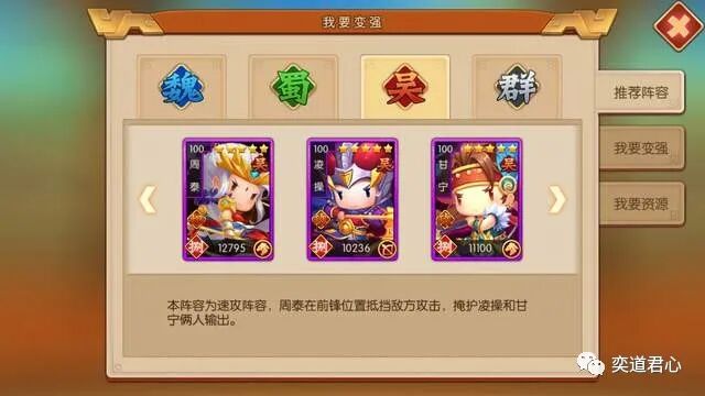 甘宁和周泰二将凭借着一骑绝尘的攻防能力,在【萌军天下】系统推荐的吴国紫将战队里拿下了三分之二的席位。周泰+凌操+甘宁,双攻一盾野蛮收人头;周泰+吴国太+甘宁,高额减伤外加高效治愈,是长期进行消耗战的首选。