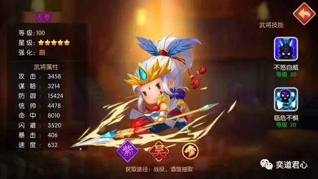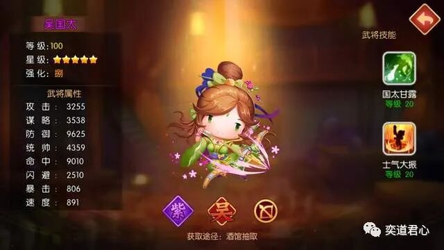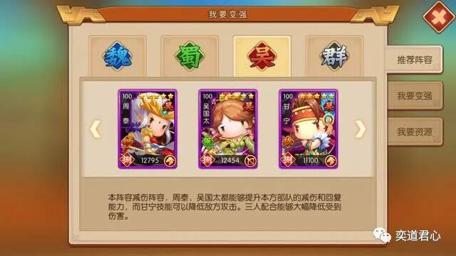 首先亮相的这位,是吴国最有气场的女人,连孙权都要叫一声“母亲”的吴国太。幸亏当时国太亲自拍板,才救了刘备一命,不然皇叔已经在甘露寺吃上了香喷喷的盒饭。【萌军天下】的吴国太凭借着把孙权抚养长大的功绩,成为了一名出色的奶妈,匹配在身上的两个技能都是附带强力的啦啦队效果。国太甘露首回合发动,为我方前排2人施加无畏buff,受到的所有伤害减半,并在之后的4个回合里,每个回合恢复30%的兵力。士气大振使得我方2人的技能伤害翻倍,持续三个回合,不过此技能必须等到第3回合才能发动。吴国太无论身份地位还是具体功能,必然是要安排在队伍的最后保护起来的。