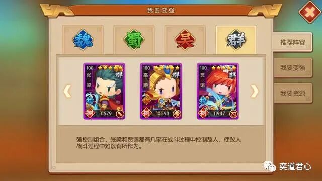 【萌军天下】系统给予张梁、高顺、贾诩三人组的评价是“强控制组合,张、贾二人都有几率在战斗中控制敌人,使得目标难以有所作为”。虽然不少三国SLG游戏的老玩家会仅凭颜色就给他们定调,然而当我们细致查看到每一个角色,就会发现其叠加效果真心不错。