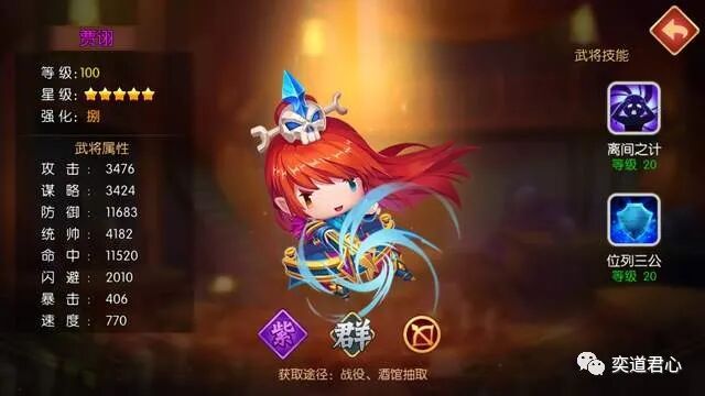 最后让我们瞅瞅贾诩,这个三言两语就数次影响东汉末年格局走向的奇男子,哪怕在【萌军天下】的普通状态只是紫色,都给人一种莫名的压迫感。默认携带弓兵出场的贾诩,肯定是要安排在中间或者后方的,他是全队当之无愧的总司令。离间之计作为单体谋略攻击技能,最核心的价值还是让目标陷入混乱状态,随便几个回合下来,就能让对方的所有武将身患不同程度的精神障碍。位列三公是个群体上盾的特技,使得友军全员最多提升六成的全属性防御,持续三个回合的高防状态真的够救命了。