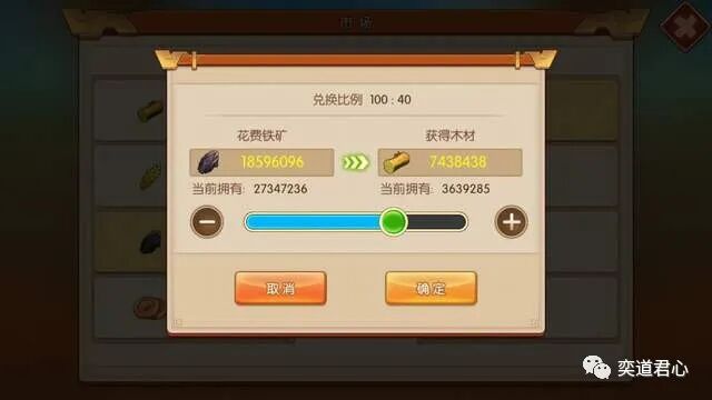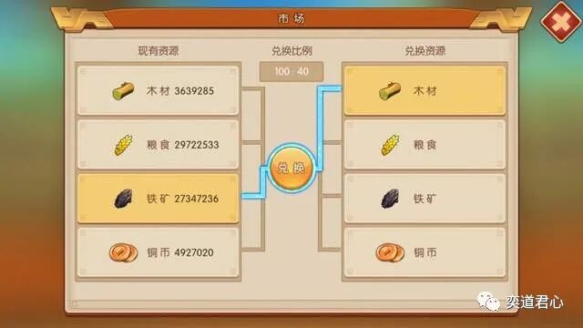 目前【萌军天下】的市场里,能够互相兑换的物资只有四类,分别是木材、粮食、铁矿、铜币,四者可以实现互通。至于比例,则以当前玩家自己市场等级对应的比例为准。比如我目前的市场是40%兑换比例,就意味着我拿100铁矿只能换40木材。
