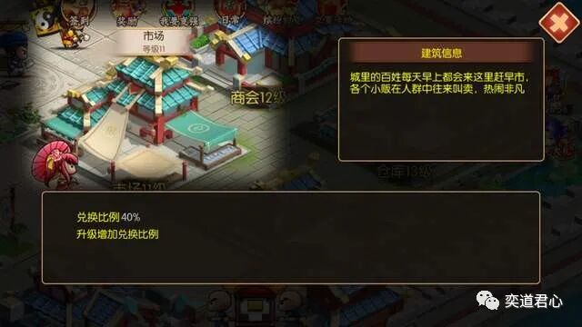 太守府、太学院、军营等直接决定军队战力的核心建筑每进行一次升级,都需要耗费海量的铜币、木材、粮食和铁矿。这需要我们在这之前就把所需的物资准备到位,利用富余的资源来贴补短缺的资源,以求最和谐且高效的发展。所以打造一座兑换比例高的市场,对玩家们在【萌军天下】的兴衰存亡至关重要。
