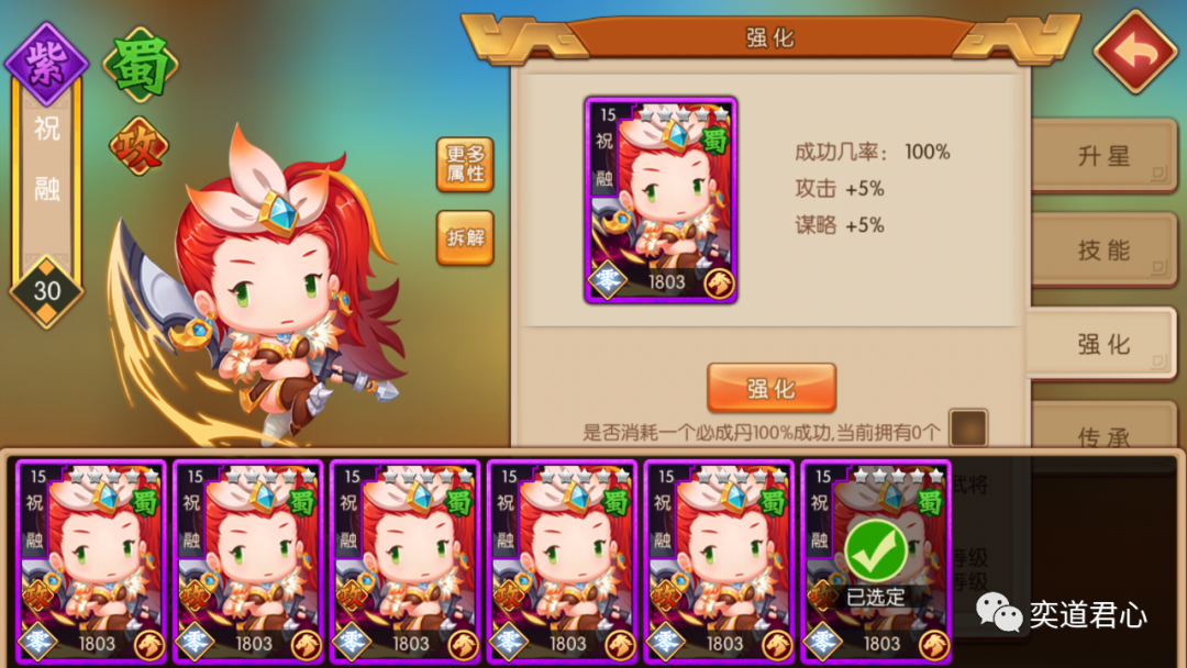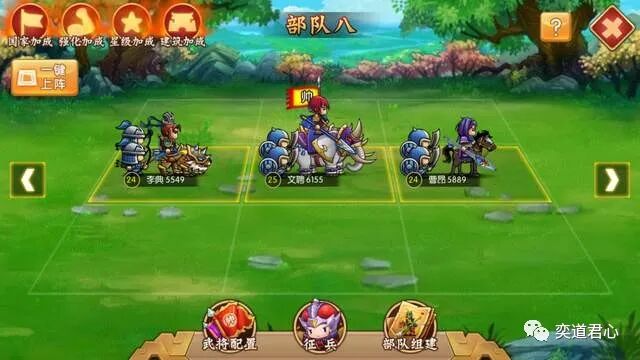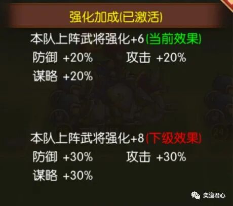 单个成员的强化程度达到标准是不够的,必须队伍里的三个武将都达到要求。虽然强化加成不提速,但是却能按照百分比来增加全队的攻防和谋略值。队伍的基数越高,最终的提升幅度自然也越大。