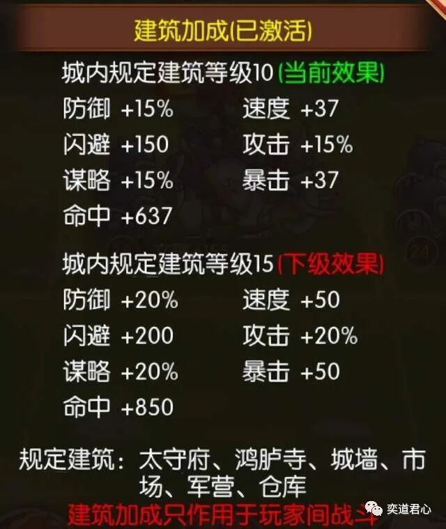 注意规定的具体建筑,太守府、鸿胪寺、城墙、市场、军营、仓库,其他房子装修得再好,对于建筑加成也是杨白劳。建筑加成只能作用于【萌军天下】游戏里玩家之间的战斗,换言之,打野开荒和刷副本是没有体现的。提升建筑加成的事情急不来,因为规定的建筑等级很高,需要耗费的时间和物资也不是个小数。
