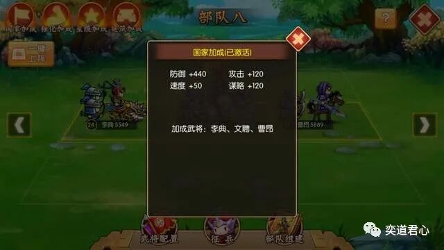 第一项国家加成效果还是比较容易理解的,就是在原则上建议三个武将必须属于同一个阵营。比如我例举的李典、文聘、曹昂都是魏国的,同一国籍的角色合并在一起就能提升全队属性。跨国合作也不是不可以,但是就会默认抛弃了这项福利,除非你的武将相当强势足以弥补这个损失,否则还是最好凑够清一色。