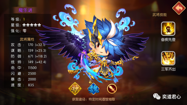 魔乐进在【萌军天下】手游里的默认携带军种是刀盾兵,具有坚实的抗击打能力,故而坦度也非常不错。历史上的乐进逢战必定身先士卒,素以“骁果”著称,镇守乌巢的淳于琼正是被他击毙,也算得上赢取官渡之战胜利的第一等功臣。结合这些史实战功,魔乐进的第一个技能就是奋疾先登,在战斗开始的第1回合必定触发,无畏(加防)、振奋(加攻)、愈合(回血)效果覆盖全员,且持续3个回合。三军齐出也是群体增益技能,在对敌方全员进行猛攻的同时,还能使得我方全员的技能伤害大幅提升,全队的进攻节奏就靠他带起来。