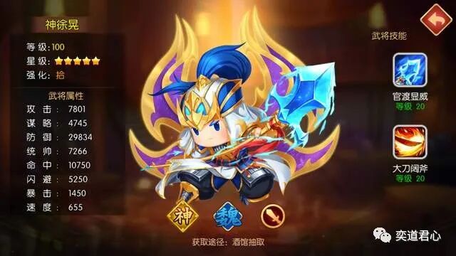 刀盾兵统领神徐晃,尽管在速度上是三将之中最慢的,然而他是真正执掌菜刀的人。官渡显威跟神张辽的技能作用有点重复,愤怒状态只能施加给神徐晃单体,所以重点还是在大刀阔斧上。神徐晃的大刀阔斧技能,在战斗开始的第一回合100%触发,使得神徐晃的攻击获得持续4个回合的群体溅射效果。