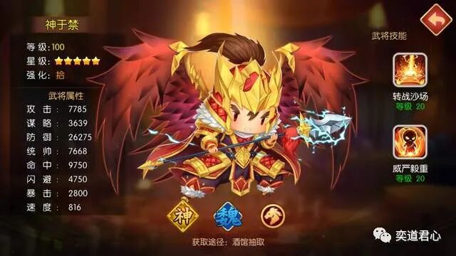 持军稳健的神于禁,犹如一块坚固的盾牌,通过转战沙场技能将敌人的普攻和技能攻击都锁死。凭借着威严毅重,神于禁能够在战斗开始的首回合就把敌方全队成员的防御力都腰斩,还会在接下来的4个回合大幅增加他们受到的伤害。攻防数值的此消彼长之间,对付绝大部分的敌军都势同砍瓜切菜,神于禁所指挥的骑兵部队也有800点的高速,大可放心不会失掉先手。