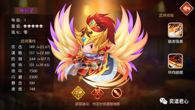 吴国真正意义上的开国之主孙坚,在【萌军天下】中也是坦克俱乐部的一员。破虏强袭技能在战斗开始的第1回合触发,令孙坚获得吸血buff,恢复量是他普通攻击伤害值的60%,持续5个回合都能一边战斗一边奶自己。所向披靡可让孙坚进行连击,提升普攻的同时免疫对手封锁,以战养战毫无破绽。