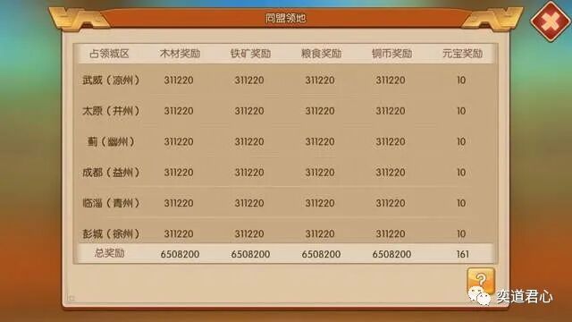 跟团混了不到1个钟头,打开领地面板乐开了花。武威、太原、蓟城、成都、临淄、彭城等州府一线城市尽数攻占,木材、铁矿、粮食、铜币和元宝的奖励数量比自己每天动手打出来的还要多,这支同盟真是选对了。每天定时上线收一收集团福利,节省了大量的时间成本,可谓背靠大树好乘凉。
