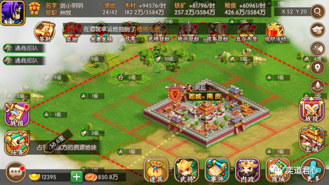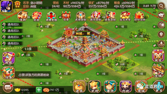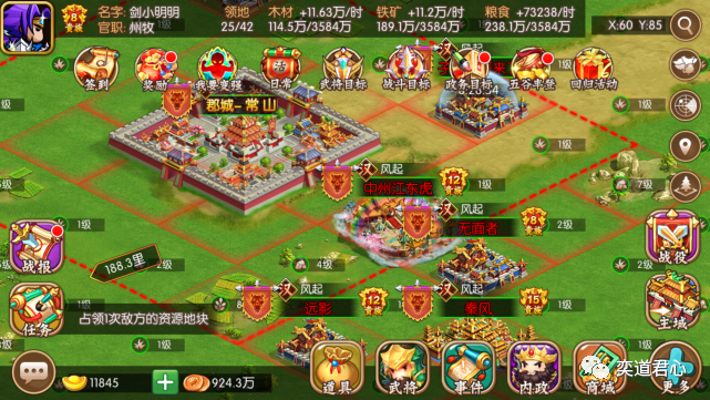 【萌军天下】邺城的坐标是(X:69,Y:79),别看这座城市如今只是邯郸下辖县郊的一处遗迹,在东汉末年那是妥妥堪比今天北上广的存在。游戏里的邺城拥有广袤的平原,高级的农田、林场和铁矿应有尽有,哪家公会想成为北方的老大, 攻占这里无疑具有举足轻重的象征和实际意义。