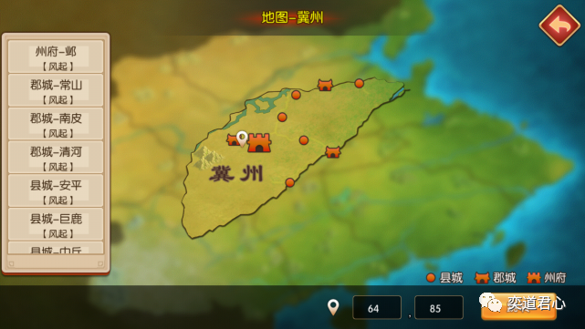 冀州北接幽州,东临青兖,西合并州,南边则是司隶。尽管看上去四面受敌,不过凭借着强大的资源体量完全可以实现“内循环”,丝毫不惧这种程度的封锁。属于冀州下辖的城池一共有9座,分别是邺城(州府)、常山(郡城)、南皮(郡城)、清河(郡城)、以及安平、巨鹿、中丘、邯郸、渤海这5个小县城。