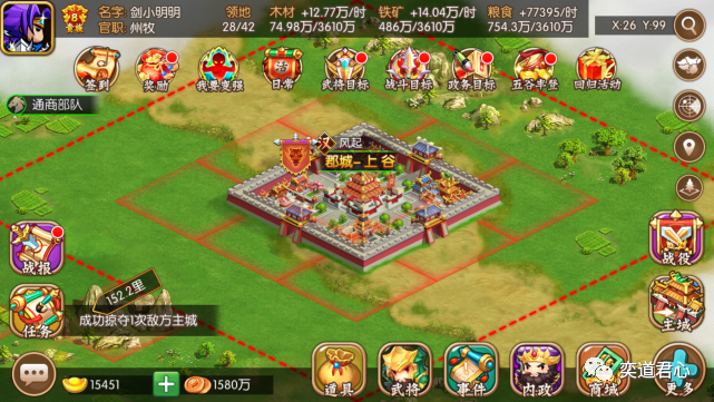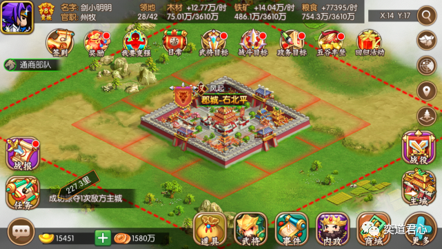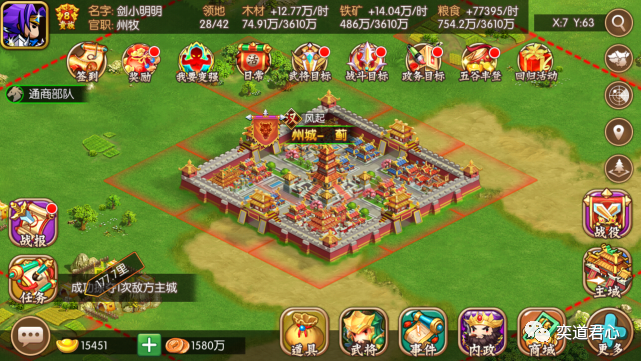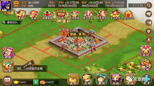 先来看蓟城(X:7,Y:63),作为游戏里的幽州州府和现实世界的祖国首都,蓟的资源储量相当富庶,高级农田、林区、矿场应有尽有。而且周边的卫星城市也很多,沮阳、玄菟、雍奴三县与蓟的距离都是近在咫尺的,玩家们可以在此迅速囤积大量物资,并通过贸易以火箭速度提升自己的GDP。