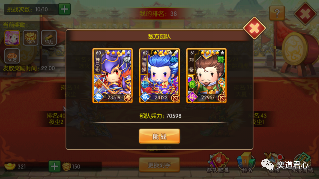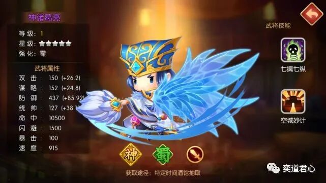 普通状态的橙色诸葛亮,在之前【萌军天下】武将系列的介绍篇里我已经详细讲过了,神级版本的诸葛亮在场控方面更是青出于蓝而胜于蓝。演义中用来征服孟获的七擒七纵战术,在游戏里被设计成了同时令2个敌军混乱的技能,首回合自动触发,还能顺手砍掉对方将近一半的防御。戏耍司马懿的空城妙计,则是可以沉默对方令之无法施放技能,普攻也削弱三成,如此强力的压制能够极大保证我方的有生力量持续稳定地发挥。