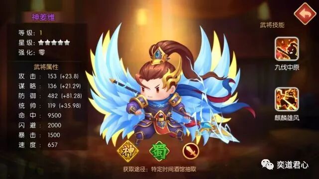 诸葛亮+魏延的组合兼顾了场控和坦克,还可以再拉上一个姜维。神级状态的姜维在【萌军天下】的技能分别是九伐中原和麒麟雄风,前者谋略群攻+封技能,后者一边轰炸一边群体回血,还能很好地补充诸葛亮和魏延。遗憾姜维在历史上出现得太晚,诸葛亮和魏延搞不拢的时候,他在蜀汉军中尚没有多少话语权,如果他能跟魏延好好打配合,蜀汉保不齐真有点戏呢。