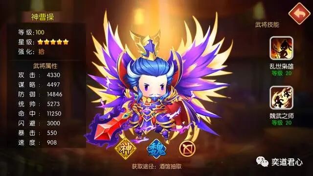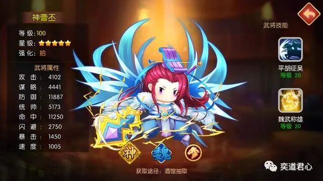 老子不坐马,换成儿子坐,神曹丕的默认携带兵种是骑兵。虽然【萌军天下】给神曹丕的定位是谋攻,然而平胡征吴(群攻+恐慌)和魏武称雄(降防+封普攻)这两个技能所体现的效果却十分诚实,神曹丕最核心的作用还是在于限制对方的攻击行为。因为兵种的关系,神曹丕的暴击和速度也是三人里面最棒的,战斗的先手要靠他来抢。纵观那么多款三国题材的SLG手游,【萌军天下】的曹丕算是真正做到了扬眉吐气,不用活在曹操的阴影之下了。