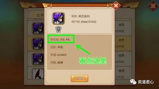 除了个人小散户,你还能通过名字来判断对方是否是工作室。其实能够找到工作室是最好的,虽然他们都是机器人小号,不过在【萌军天下】的系统判定规则下,都是能让我们获得100%通商收益的玩家。手指轻轻一点所在地坐标,就能自动跳转过去。