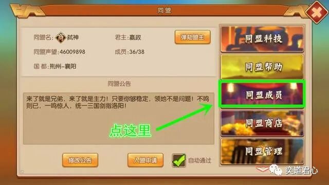 先在右下角的“加号”调出系统工具栏,进入到同盟面板中。再在同盟的功能区点选“同盟成员”进入,从这里面就能找到和你一样的玩家。
