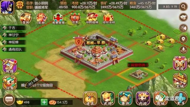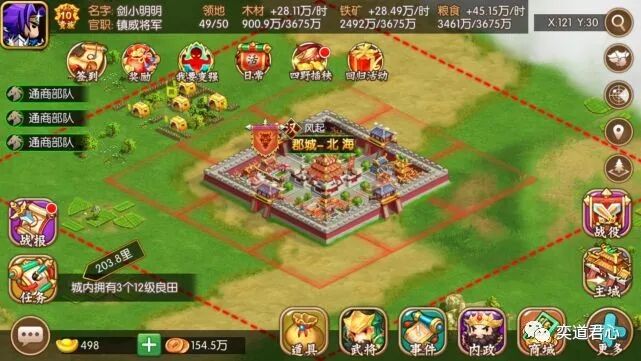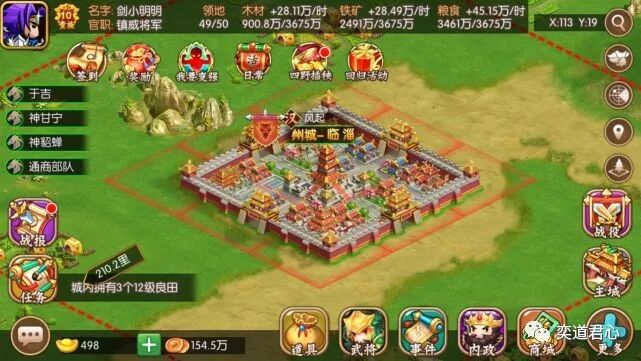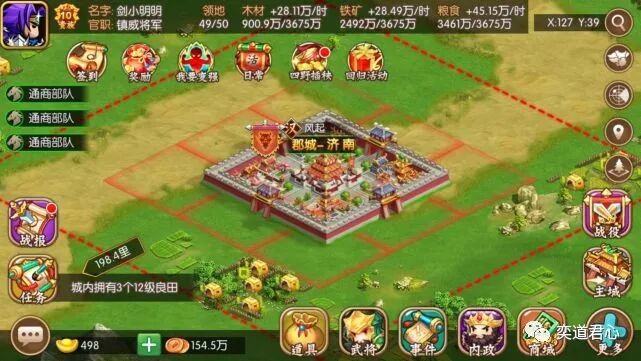 先来看“大哥大城市”州府临淄(X:113,Y:19),尽管现在的临淄已经是淄博市的一个区了,但是在东汉末年可是名副其实的一线城市。【萌军天下】的临淄城特产,主要是高级铁矿和农作物,地处青州的核心地块也是四通八达,相当适合尚未找到同盟的落单新手发育。
