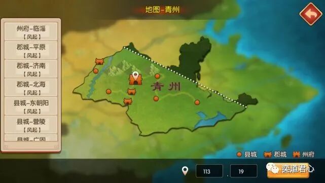 最后晒出的平原(X:85,Y:19),是青州唯一坐落在黄河北边的郡城,刘备历史上还在这里做过官,就是我们熟知的平原相。不过这个地方实在是没啥资源,应该是青州的主要城市里最穷的,难怪刘关张兄弟三个在那里那么久都发育不起来。至于其他小县城就更没啥可说的了,大家还是尽可能在临淄附近找地方落脚的好。