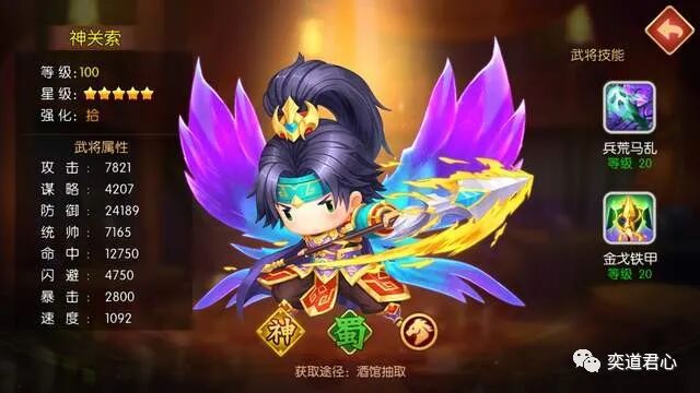 身为主将的神关索,默认携带骑兵出战,速度上自然相比其他兵种的武将享有巨大优势。他的首技能兵荒马乱,对敌方全体进行群攻并对目标附加易损状态,如果此时目标正处于混乱中,还会额外增加伤害。二技能金戈铁甲在战斗开始的第1回合就能自动施放,为我方全体增加攻防数值,同时导致2个敌人陷入混乱。在某种程度上,关索也算得上是个优秀的辅助,能文能武素质全面。
