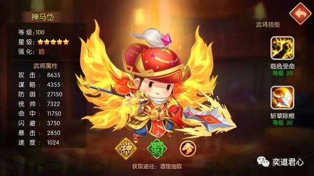 西凉马家仅次于马超的猛将,【萌军天下】神马岱的菜刀属性丝毫不逊于兄长。临危受命是被动技能,第1回合就触发,4个回合内大幅增加马岱自身的技能伤害和主动技能的发动概率。主动技能斩草除根确实吓人,高额全体群攻之后附加流血和混乱,对面的医疗表示压力山大。