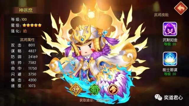 同样以骑兵为默认兵种的神徐庶,一看就知道是顶级的法骑英雄。沉默如金除了对目标全体造成高额的谋略伤害,还能封印他们的主动技能,这是神徐庶的看家本领。能士匿谋虽然没有实际的攻击作用,但是能在5个回合的时间内大幅提升全队的谋略、防御、技能伤害值,还免疫敌方施加的封印效果,保证普攻的稳定。