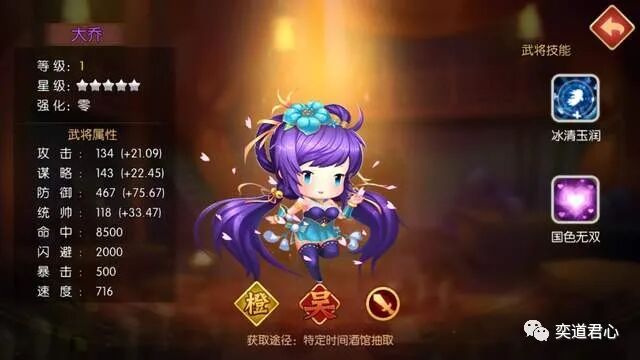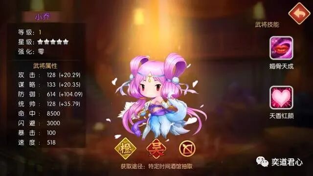 光有徐晃那样的坦克和轰炸机明显不够,真正起到画龙点睛作用的是中军位置上的小乔。【萌军天下】的普通橙小乔擅长辅助,媚骨天成名副其实,专门把敌人的骨头变稣,让他们使不上劲儿。尽管媚骨天成的施放概率只有30%,却是覆盖敌人全体的虚弱效果,只要小乔发挥稳定,这支队伍可以轻松应对比他们等级高出10%以内的对手。天香红颜则是同时加防和回血的技能,只能在后勤上做一定的补充,跟姐姐大乔的回血能力没法比。