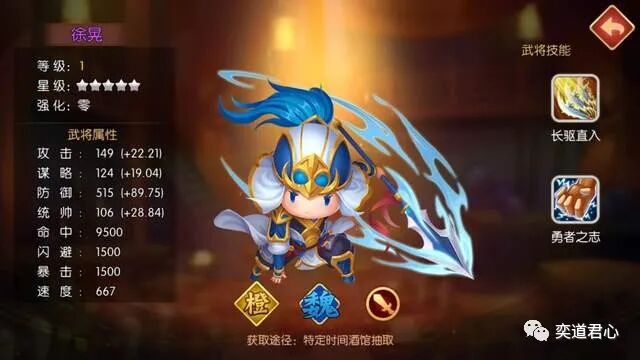 徐晃是全队的先锋,自然得先来介绍下他。尽管【萌军天下】的徐晃有神级版本,不过培养成本更为低廉的普通橙色徐晃反而在平民玩家的眼里更为吃香。默认携带刀盾兵出战的徐晃具备极为坚韧的抗击打能力,皮肤与生俱来就比其他人更硬。徐晃的长驱直入本就是同时攻击两个目标的群攻技能,而且附带的溅射效果,几乎对敌人形成了完整的刷屏伤害。勇者之志在战斗开始的首回合就令徐晃的攻击力大幅提升,并进入普攻连击状态,玩家唯一要做的就是立马把徐晃至少强化到一级,因为零级是无法学习到勇者之志的,只会一招的徐晃威力必定大打折扣。
