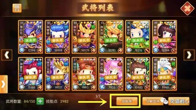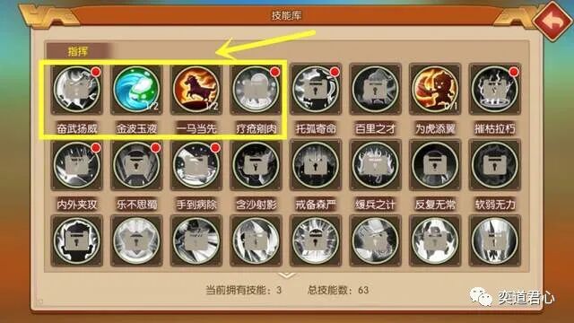 点击武将栏的按钮,进入到武将列表之后,再选择最底部的技能库就可以打开一个全新的小世界。必须要说明强调一点的是,里面所有的技能都只能安装在第三个技能槽中,有且只能装一个,不可以兼容,所以我们必须对每个技能的效果都要有起码的了解。