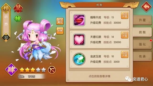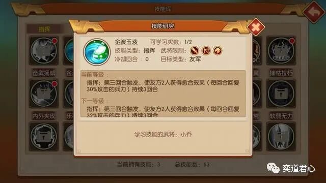 毫不利己,专门利人的金波玉液我已经学了,目前是安排小乔持有的。因为小乔在【萌军天下】手游里具备非常厉害的群体虚弱能力,让她再掌握一招群疗就足够支撑全队的续航了。同样需要在战斗进行到第三回合才可以启动,再怎么样也得挨住敌人前面的两板斧。