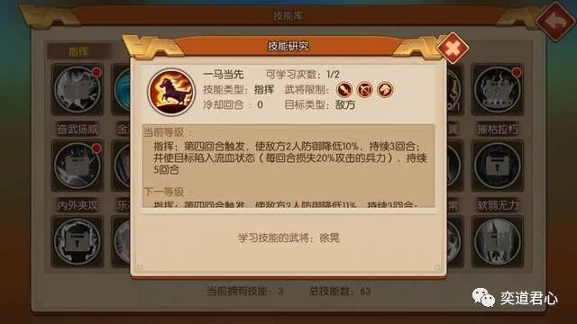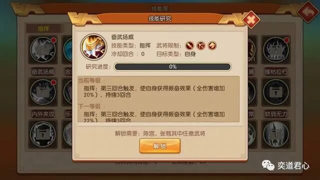 这个技能的效果比较简单,就是纯粹给自身大幅度提升攻击力,对全种类伤害都有效。不过需要坚持到战斗开始的第三回合才可以发动,意味着前两个回合不能被敌人拿下或者压制,所以队伍里最好带个医生。解锁学习的条件,是要拿陈宫或者张苞的其中一人来换。