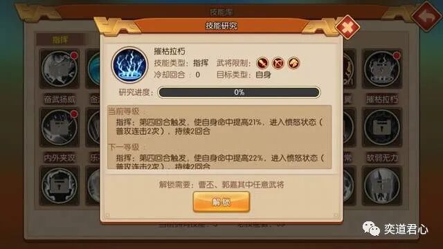 出自《汉书·异姓诸侯王表》,“镌金石者难为功,摧枯朽者易为力”。【萌军天下】的摧枯拉朽在战斗进行到第四回合的时候发动,令持有者自身大幅提升命中,并进入普攻连击状态。人中吕布、五虎上将的最爱,总之谁喜欢玩菜刀就让谁学准没错。特别是一边输出还一边按照伤害值进行回血的角色,搭配摧枯拉朽简直接近无敌。解锁这个技能的代价,是牺牲曹丕或者郭嘉。