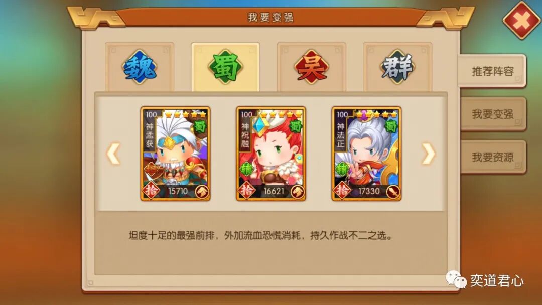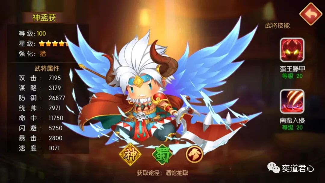 主打Q萌画风的休闲策略手游【萌军天下】,或许遵循的是诸葛亮平定南蛮之后的时间背景,那时候的孟获对诸葛亮彻底心服口服,从法理层面来看,当时的南中地区就是蜀汉的一部分。基于这个逻辑,孟获一家老小就不再是群雄,而完全效力于蜀汉了。神孟获+神祝融,再有神法正来补充智力上的短板,三人组成了蜀汉阵营的王牌坦克大军。