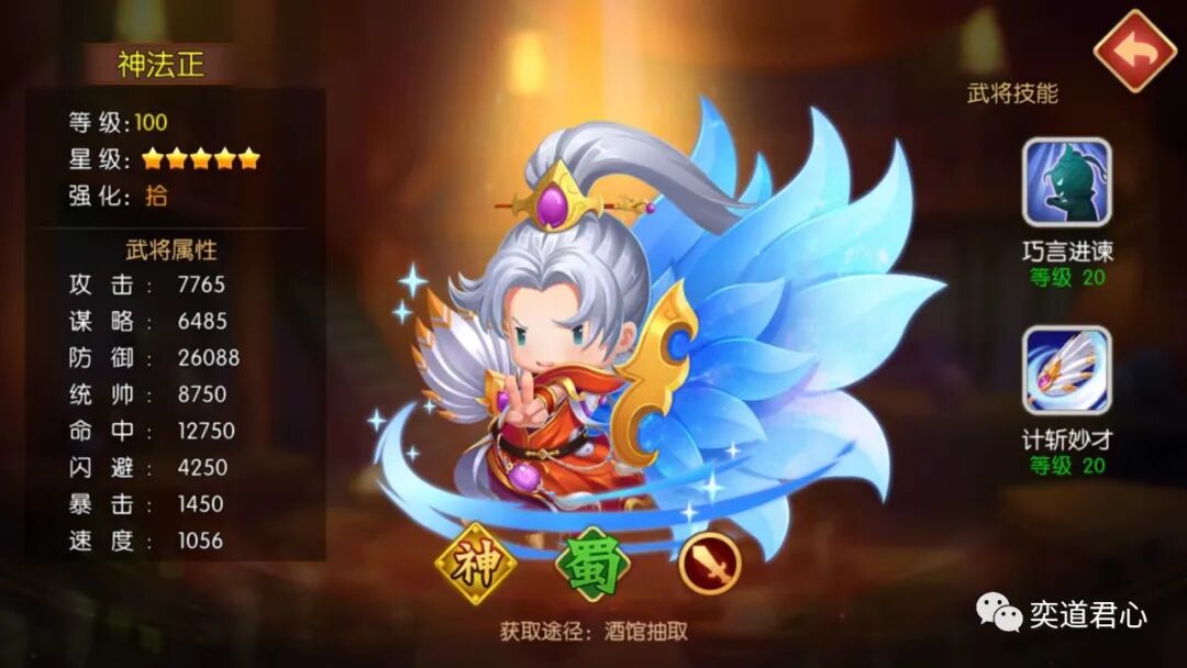作为这支队伍唯一的智将,神法正既要承担弥补智商的任务,也要肩负起医疗救治的职责。巧言进谏的技能效果,就是让本队全员受到普攻的伤害减半,并连续4个回合为大家持续回血补兵。计斩妙才,则让本队的2名队员随机获得恢复愈合、精准命中、无畏减伤状态,这是100%触发的技能。别看法正的技能都没有进攻性,可他的发挥将直接决定了全队的生存和续航。