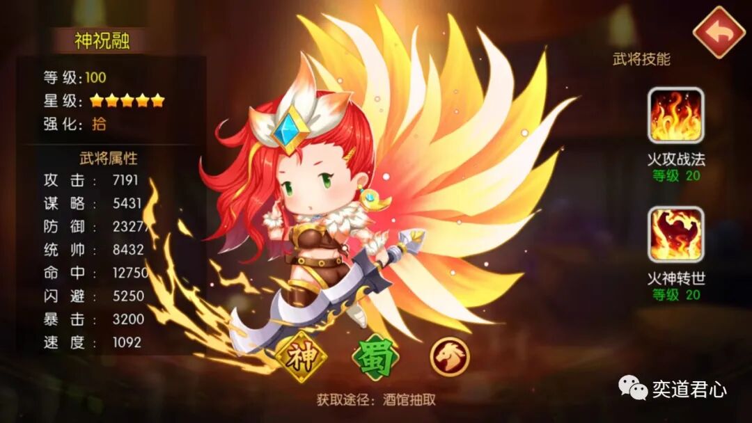 正所谓“夫唱妇随”,看着老公那么给力,老婆祝融不甘落后也开启了仙人模式。【萌军天下】的神祝融虽然定位是辅助,但是火力输出丝毫不逊于菜刀选手。她的火攻战法在群体杀伤对手的同时,还附加了恐慌(每回合按目标武将的谋略百分比损失士兵)效果,被攻击的目标在攻防状态上也会打对折。火神转世技能没有攻击作用,而是大幅度提升本队全体成员的谋略、防御、暴击,并在接下来的2个回合免疫封印和流血的负面buff。