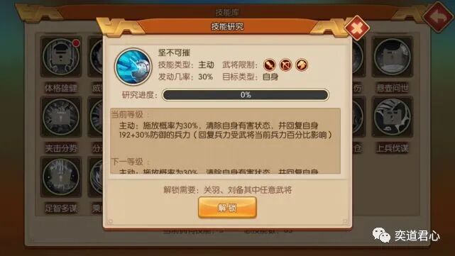 尽管这项主动技能的施放概率不高,只有30%的成功率,但是可以清除自身的所有负面状态,并为角色恢复兵力。值得注意的是,恢复量是与该武将的防御值挂钩的,故而最优搭配的对象应该是坦克型的选手。解锁坚不可摧的武将,分别是刘备或者关羽,两人都是橙色级的,代价并不低。