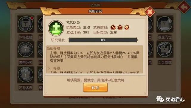 这一听就是大血包技能,立即同时治疗2个友军单位,恢复量与发动武将的谋略值挂钩,所以这个只能让高级谋士装备。不过【萌军天下】的救死扶伤,其价值绝不仅限于治疗, 驱散整支队伍的不良状态才是重点。想要研发这个技能,你需要牺牲夏侯惇或者周瑜之中的一人。