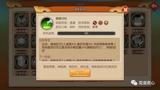 提升友方2个角色的速度(10%)、普攻伤害(10%)并施加急救回血,恢复量与谋略成正比。随着技能等级的提升,速度和普攻伤害的加持也是逐级递增1%的。悬壶问世的增益项目非常全面,战略价值非常高,所以祭献的角色也相对稀有,神貂蝉、神吕布、神左慈、神张角其一。