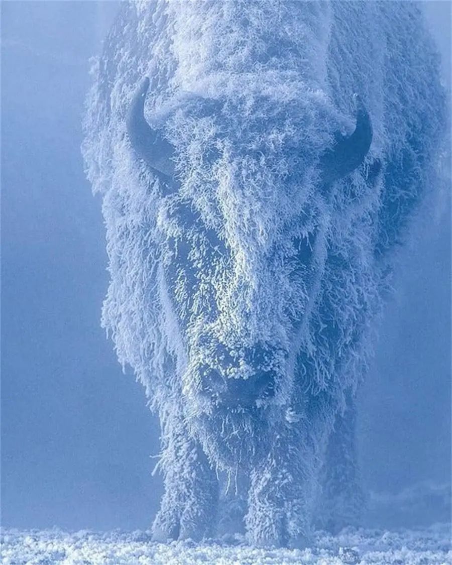 冰雪中的野牛,冰雪完全覆盖了它的毛发,看起来十分壮观。