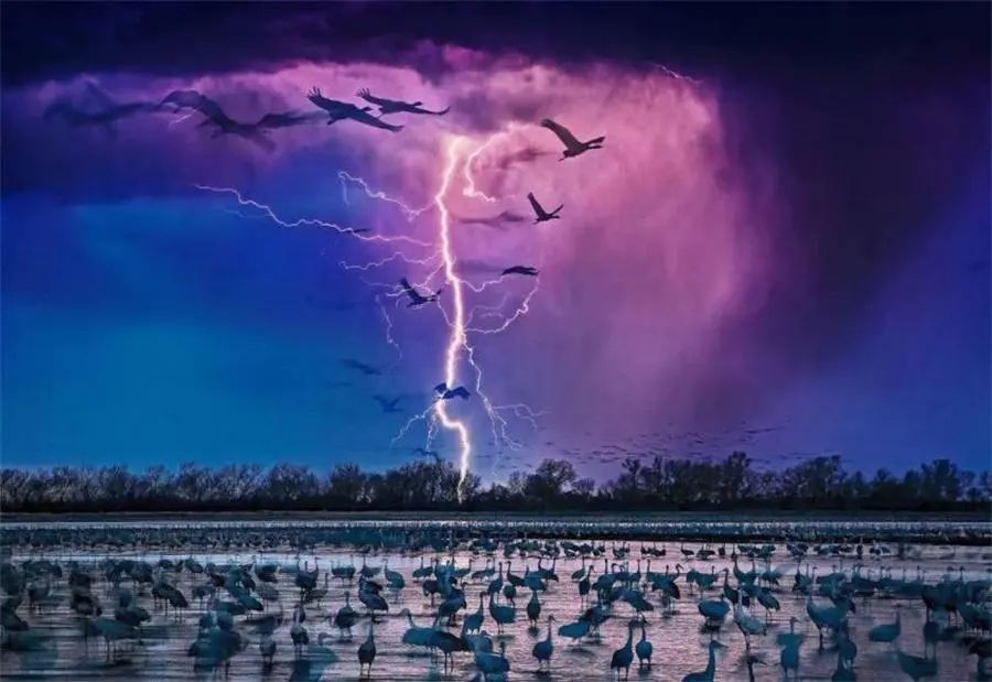 美国普拉特河上空的惊人闪电,照亮了上万只沙丘鹤的栖息之地。