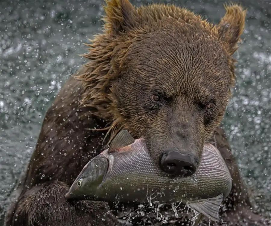 俄罗斯堪察加棕熊保护区,一头熊从水中捕捉到一条肥硕的鱼。