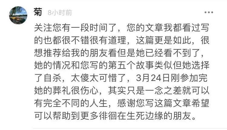 感些您写这篇文章,希望可以帮助到更多徘徊在生死边缘的朋友。