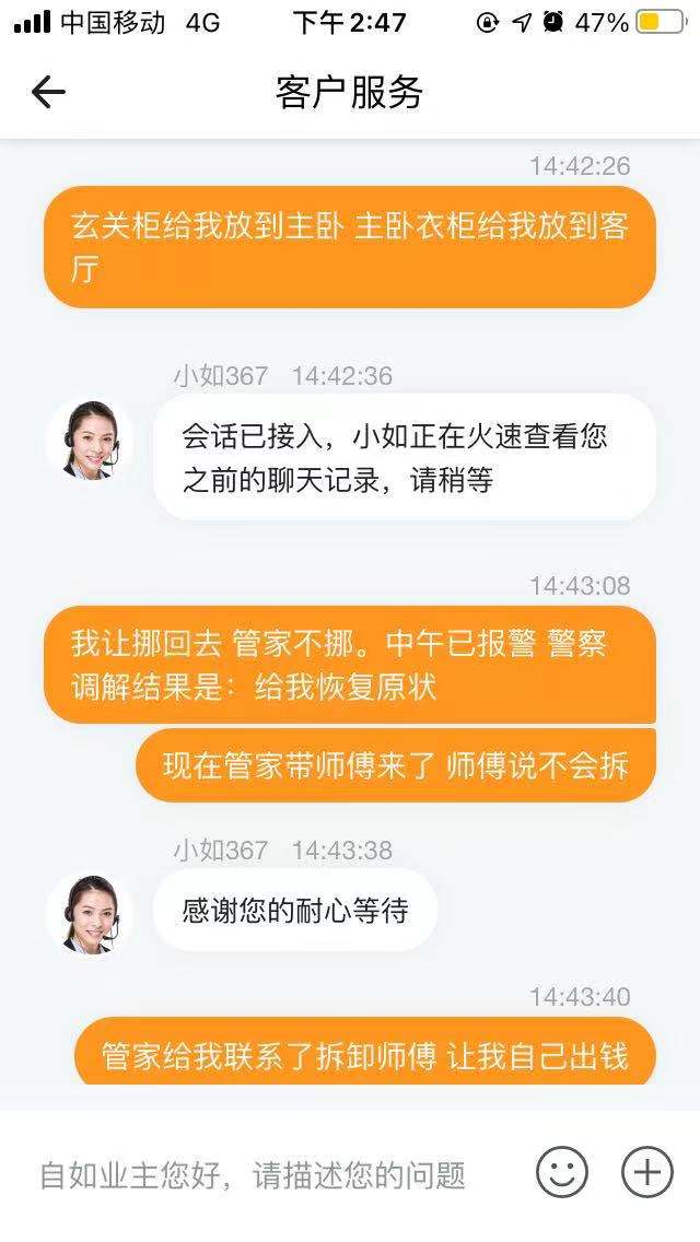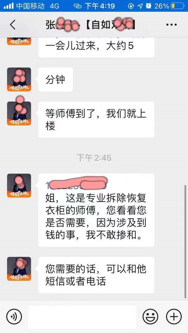 2:30PM,管家说给我联系了外面专业做拆卸衣柜的师傅,200块。如果可以,一会儿就能到。