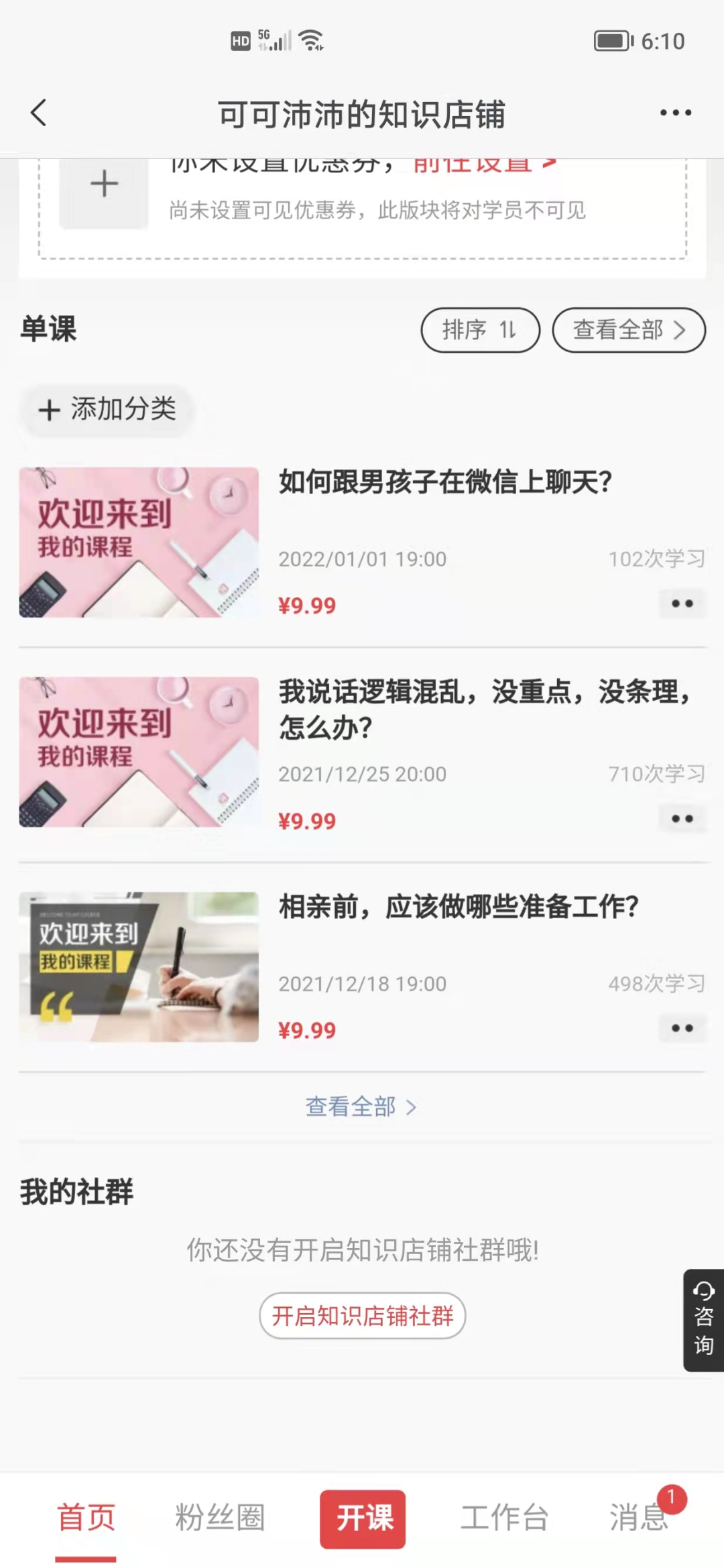 2021年12月18日我开通了千聊,千聊知识店铺的名字叫:可可沛沛。