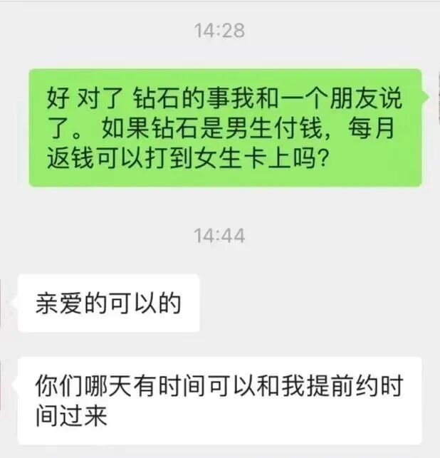 柜姐说:很简单。比如您买了一个钻戒,实付2万。那么我们会分3年把2万返给你,每月把555.55元打到你的银行卡上。