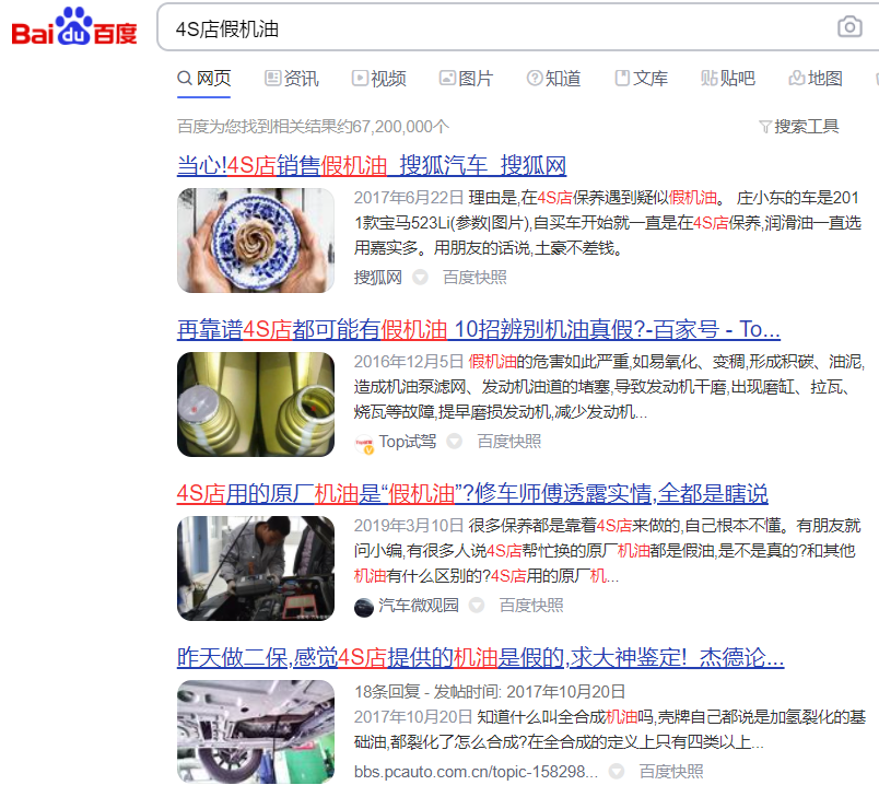 笔者以“4S店假机油”为关键词,在百度上搜索发现,网友对4S店是否使用的一定是正品机油已经产生了质疑。