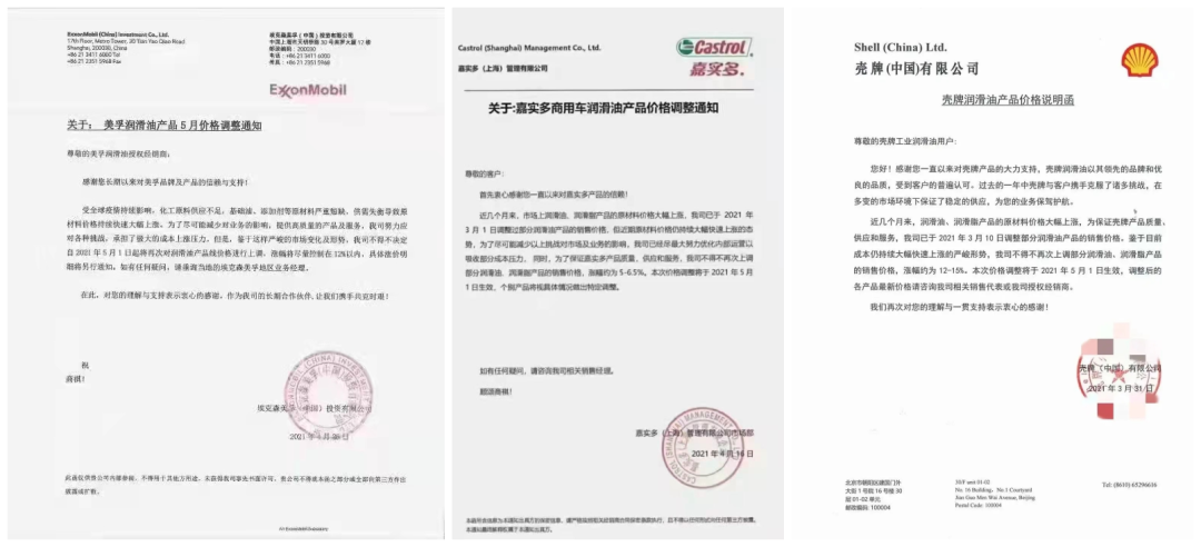 壳牌的涨价通知中提到,部分润滑油产品的涨幅约为12-15%;嘉实多通知单表示的涨幅约为5-6.5%;美孚润滑油通知单则表示,涨幅将尽量控制在12%以内。上述三家的价格调整将于2021年5月1日生效,长城润滑油则计划于5月8日上调价格。