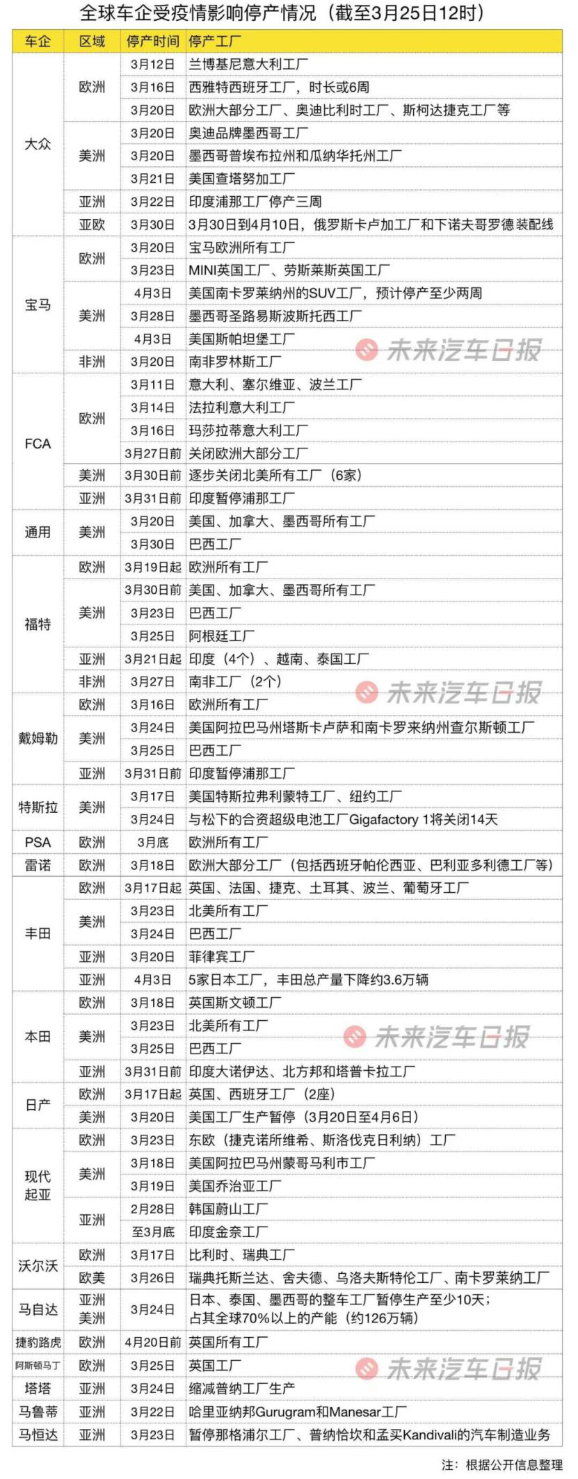 截至3月25日,全球已经停产和即将停产的整车厂总数已经超过100家。特别是在疫情较严重的欧洲,包括标致雪铁龙、大众汽车集团、宝马、丰田、戴姆勒、雷诺等14余家车企已经或计划关闭部分或全部欧洲工厂。