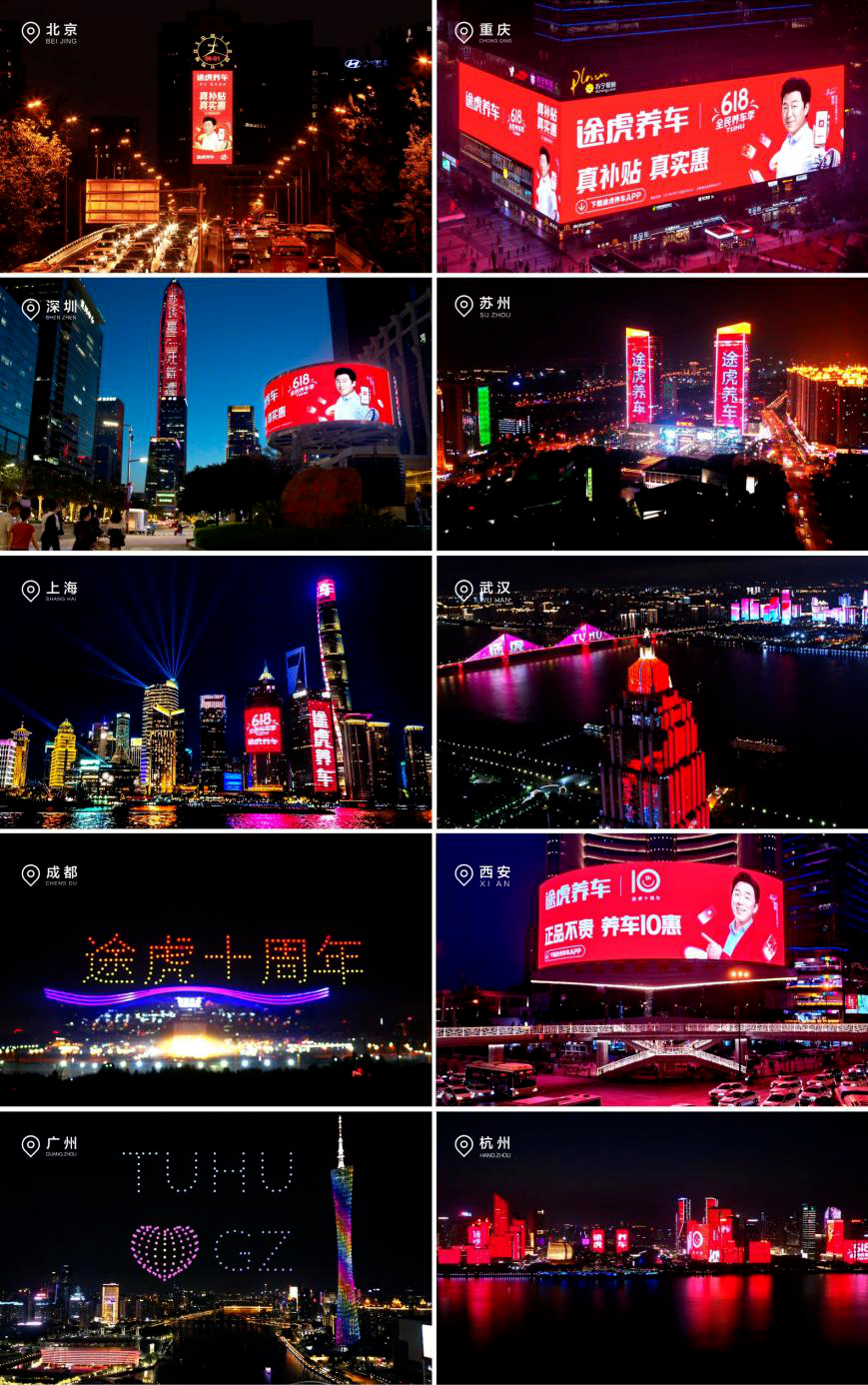 6月1日起,途虎养车就在北京、上海、深圳、广州、武汉、杭州等全国10大重点城市核心商圈地标,上演“途虎618 全民养车季”灯光秀。“途虎十周年”、“全民养车季”、“真补贴 真实惠”等标语十分醒目。